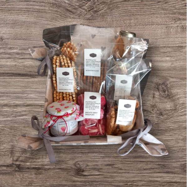 Seizoensbroodmand Claeyre&Eef gevuld met handdoek Cl&Eef, 1X appelsap 0.75cl, 1X amb.wafels, 150g amb.zachte snoepjes, confituur 200g, 100g dessertkoekjes, 1pak truffels; dessertkoekjes