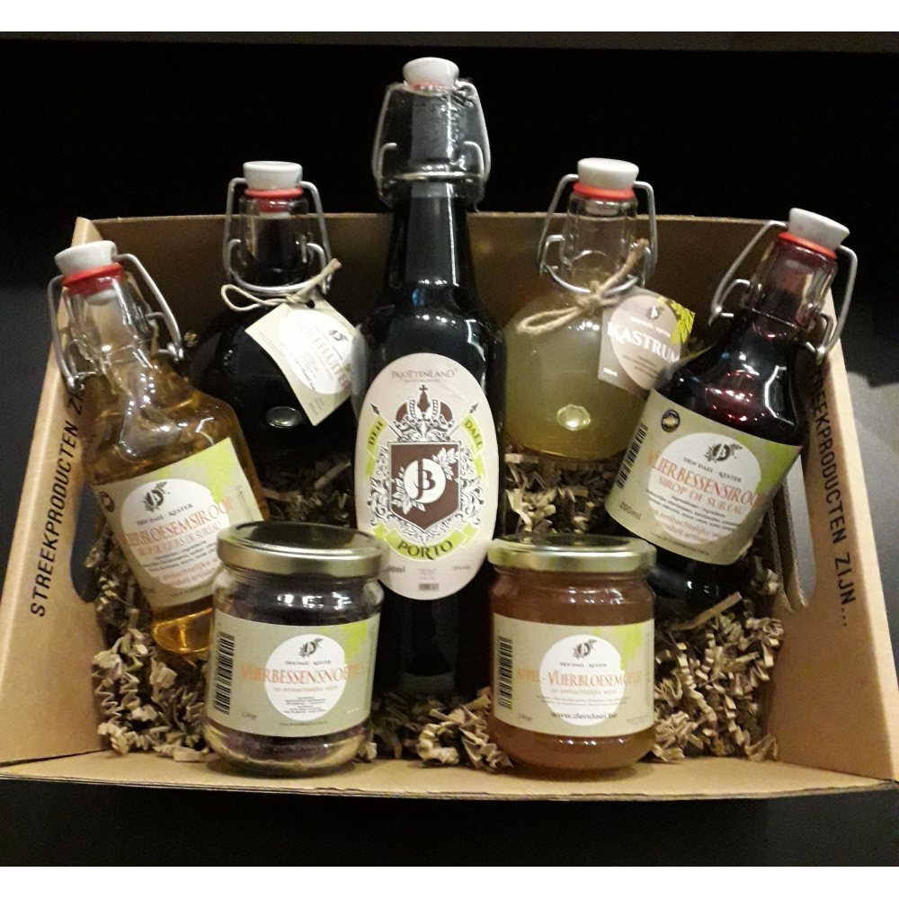 Inhoud: 1 Vlierefuiter 200ml, 1 Kastrum 200ml, 1 Porto 500ml, 1 vlierbessensiroop 200ml, 1 vlierbloesemsiroop 200ml, 1 confituur Den Dael, 1 pot vlierbessensnoep