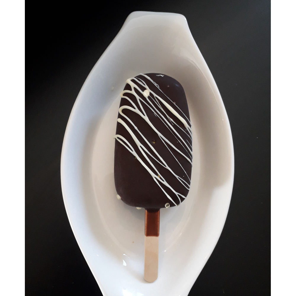 frisco met vanille-ijs omrand met pure chocolade, afgewerkt met witte chocoladelijntjes