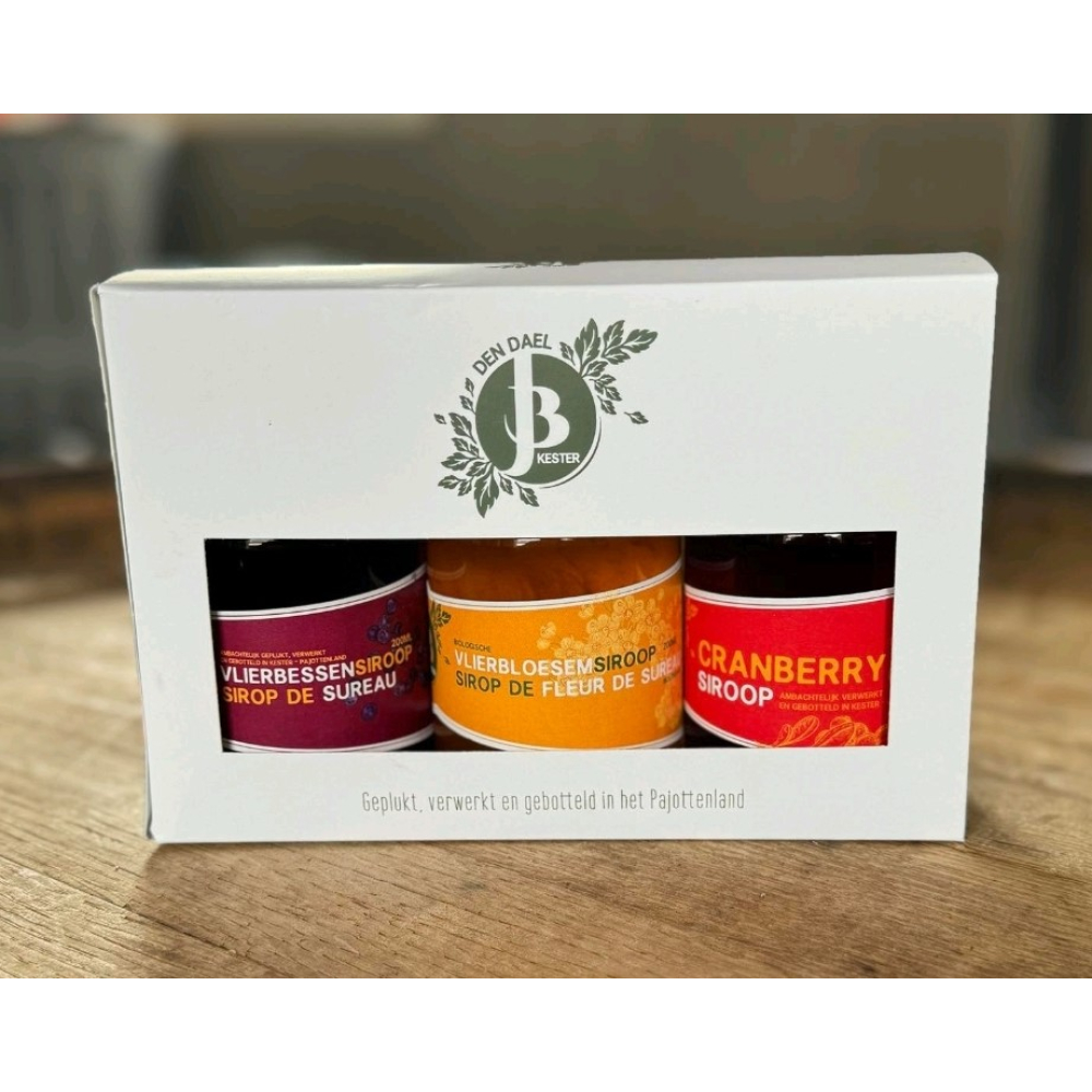 Deze geschenkset bevat 1X 200ml cranberrysiroop, 1X 200ml vlierbloesemsiroop, 1X 200ml vlierbessensiroop.