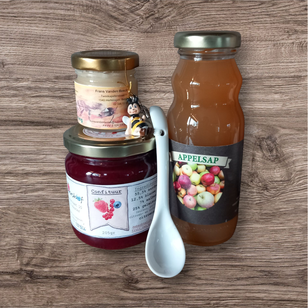 Juf pakketje voor een BIJzondere juf met: honing 50gr, appelsap 0.2L, confituur 200g, confituur of honinglepel met bijtje