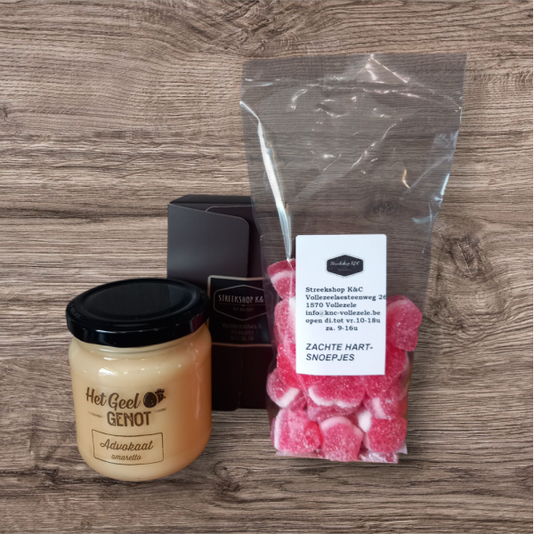 Pakketje met doosje van 250g pralines, pot advokaat 228ml, 1 zakje ambachtelijke snoep. Verpakkingsdoos afhankelijk van seizoen
