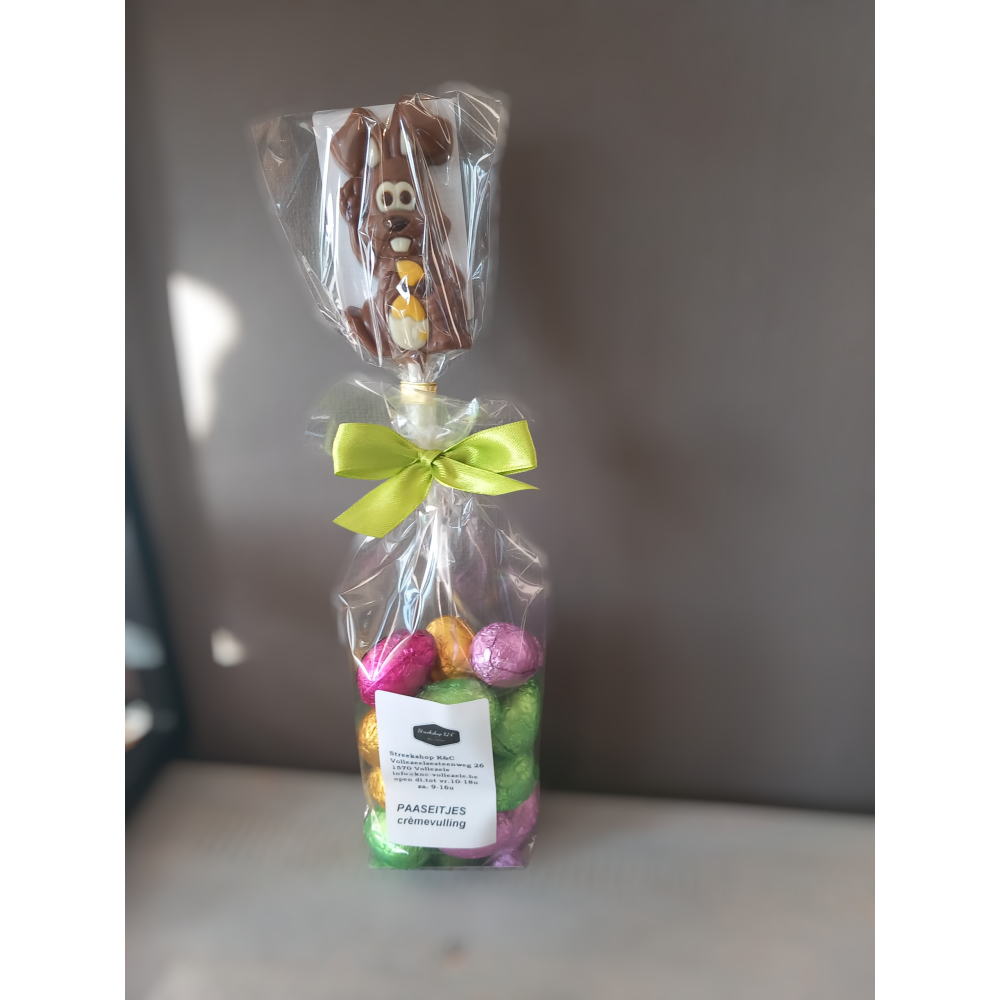 zak van 200g paaseieren melk/wit/puur met cremevulling en pralinevulling.