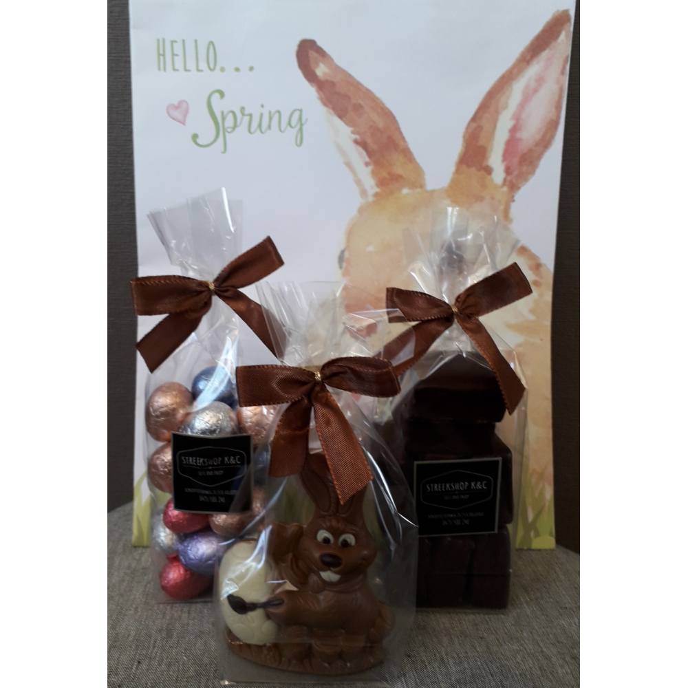 Mooie paaszak gevuld met 200g paaseitjes, 1 zak chocoladespekken, 1 paasfiguur, 3 paaseieren, 1 zakje paasguimauve