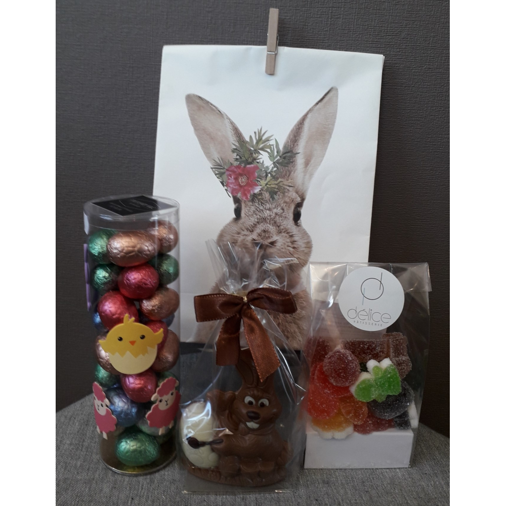 Mooie paaszak gevuld met 200g paaseitjes mix, 1 paasfiguur 10cm, 1 zak artisanale snoep 200g