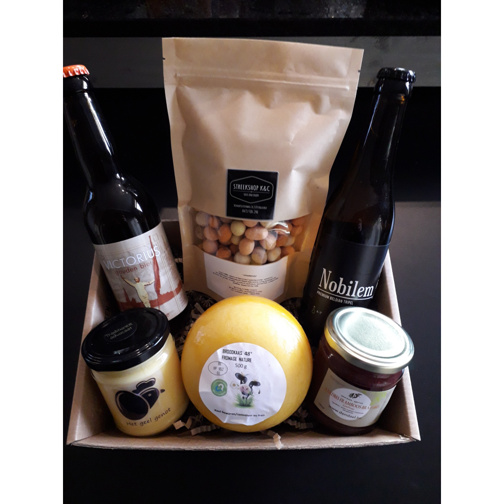 Streekpakket 3 omvat 1X advokaat 200g,1X confituur 200g en 1X Nobilem en 1Xpatience Brouwerij Eylenbosch,1X cocktailnootjes 200g, 1 kaasbol 500g