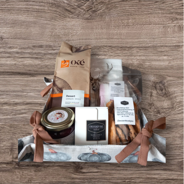 Broodmand Clayre & Eef (volgens stock winkel) gevuld met 1X OKE koffie gemalen 250g, 1X confituur 200g, 125g pralines, 1zakje spekken, 1X 100g dessertkoekjes en 1pakje servetten