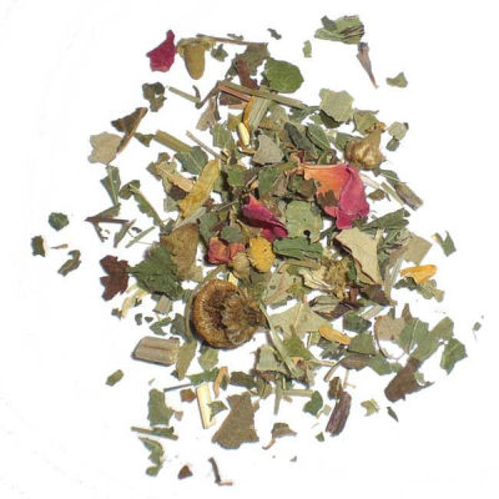 Ingredienten: appelstukjes, pepermuntblaadjes, frambozenblad, kattevoet, braambessenblad, zwarte bessenblad, kaasjeskruid, saffloer