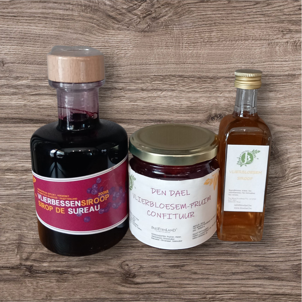 Pajots Pakket met 1Vlierbloesemsiroop 50ml , 1 pot vliergelei 200g, 1 vloerbessensiroop