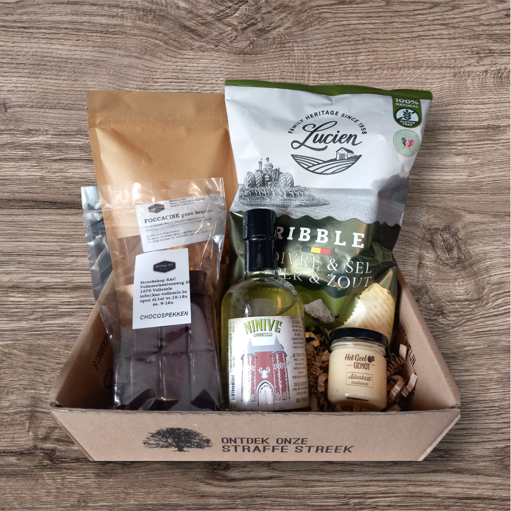 Dit mooi winterpakket omvat 1 Limoicello 200ml, 1 advokaat 42ml, 1 zak chips, 1 zak chocospekken en 1 zak aperokoekjes